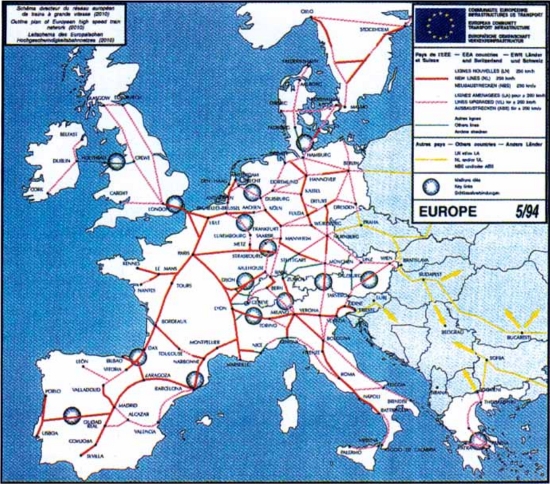 La figure 2 montre une carte de l’infrastructure en transport de la Communauté européenne, présentée lors de la conférence de Crête et montrant un « Aperçu d’un réseau de transport ferroviaire européen à grande vitesse – 2010 ». En plus des lignes à grande vitesse pour la Grèce elle-même, le schémas montre des flèches-vecteurs dans le reste des Balkans indiquant la direction d’autres routes à définir. Il va sans dire qu’une très faible partie des travaux envisagés pour « 2010 » se sont matérialisés, la seule exception étant la complétion, historique, du canal liant le Danube au Rhin, créant ainsi une voie navigable à travers toute l’Europe, de la mer Noire à la mer du Nord, comme l’avait imaginé Charlemagne il y a plus de mille ans.