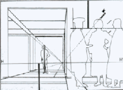 Quand on compare le plan au sol (Fig. 9) avec ce qu’on voit sur le tableau, on constate effectivement un sens harmonique de l’espace, mais l’effet spatial s’opère plus par suggestion que par déploiement.
