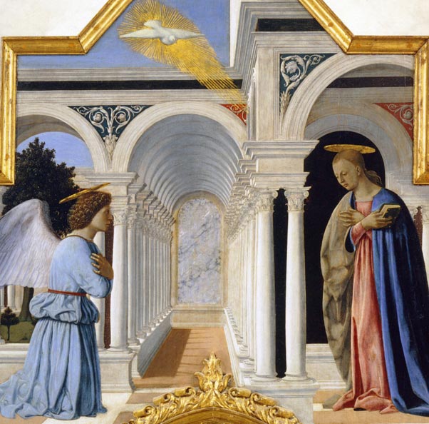 Ce procédé compositionnel apparaît peut-être encore plus brillamment dans l’Annonciation (Fig. 11) qui figure dans le fronton du Polyptyque de saint Antoine. Un effet de quasi-inversion de l’espace s’y opère par la coïncidence des opposés. Piero savait qu’il fallait réserver la perspective classique pour le domaine du « mesurable », mais que pour exprimer « l’incommensurable » et ouvrir les yeux de l’intellect, il fallait planifier un effet non-linéaire mais légitime. Dans l’Annonciation, il intensifie cet effet en plaçant une plaque de marbre au fond du couloir qui annule quasiment l’effet de perspective qu’il vient de créer avec virtuosité avec les colonnades du couloir. Cette plaque de marbre est peut-être la représentation du mur de la coïncidence des contraires ? S’agit-il des portes du Paradis, c’est-à-dire l’ouverture vers la révélation ?