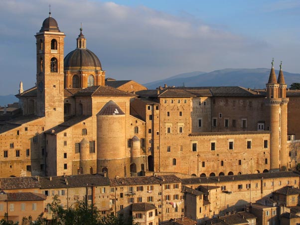 En alliance avec les papes humanistes, Montefeltre fera d’Urbino une pépinière de talents. Son palais à Urbino (Fig. 6), construit par Luciano Laurana, employait plus de cinq cent personnes et était décoré de marqueteries (les fameuses intarsia) et de trompe-l’œil.