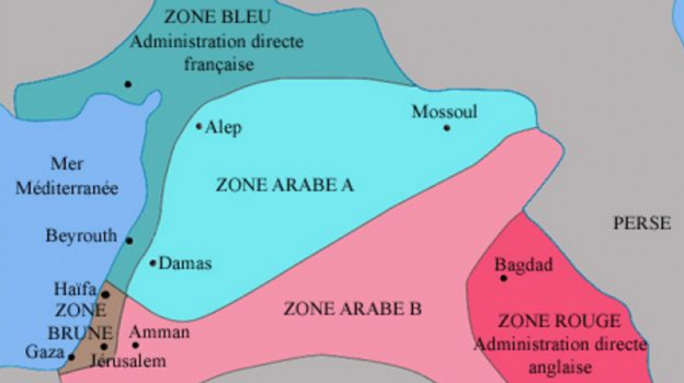 On peut en effet difficilement comprendre les implications de la nouvelle orientation de la politique étrangère française depuis 2002-2003, sans les situer dans le contexte historique des accords que la France coloniale a passés au début du XXème siècle avec la Grande-Bretagne coloniale, pour la conquête et le partage d’importantes parties du Moyen-Orient. L’accord Sykes-Picot de 1916 fut un arrangement secret signé entre Anglais et Français pour redessiner la carte de l’Asie du Sud-Ouest, attribuant aux deux puissances coloniales des zones de contrôle direct et des sphères d’influence, comme nous le verrons plus loin.