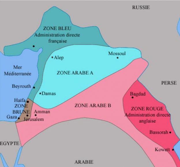 Lors des négociations, Picot fait prévaloir que la France doit exercer un contrôle direct sur les régions côtières et un contrôle indirect sur le reste de la Syrie (par le biais d’un régime fantoche) et sur le territoire s’étendant à l’est jusqu’à Mossoul.