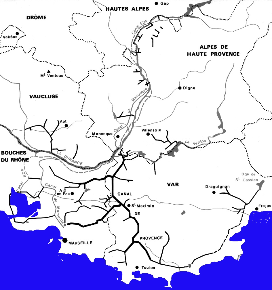 C’est à l’instigation de Jean Monnet et du Commissariat général au Plan que l’on décida d’une approche plus globale. On décida, dans un premier temps, d’entreprendre l’aménagement hydroélectrique de la Durance et de constituer, grâce au barrage de Serre-Ponçon, d’importantes réserves d’eau pour l’irrigation des zones agricoles de la basse Durance. Une fois ces approvisionnements sécurisés, on put ensuite, en constituant des réserves supplémentaires par la construction de plusieurs barrages sur le Verdon, mettre en place la structure qui aurait pour tâche d’entreprendre la construction du Canal de Provence, un système global de livraison d’eau pour l’ensemble des autres régions. (La prise d’eau principale se fera à partir du Verdon, comme indiqué par le trait pointillé situé au centre de la carte.)