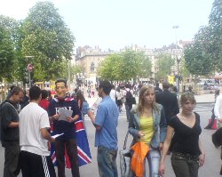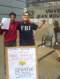 Notre table juste devant la fac de Lyon III, fac de droite par excellence, a fait peur à quelques étudiants victimes du Sarko-masochisme. Surtout que l’un d’entre nous avait revêtu un masque de Sarkozy, avec un t-shirt FBI et un drapeau britannique (voir photos). Deux jeunes étudiantes d’une autre fac avaient décidé de se mobiliser aussi pour Ségo et de diffuser quelques invitations pour son meeting, l’une d’elle a fini par enfiler le sarkostume et nous a aidé dans la diffusion de nos tracts ; elles étaient impressionnées par notre capacité à aller au contact des gens !
