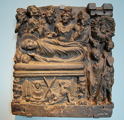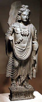 La sculpture bouddhique de Gandhara montre l’influence de l’art de la Grèce antique lors des conquêtes d’Alexandre. Les cheveux ondulés, l’habit drapé couvrant les deux épaules, les chaussures et les sandales, les motifs hellénistiques tels que les feuilles d’acanthe sont caractéristiques de l’école de sculpture de Gandhara.