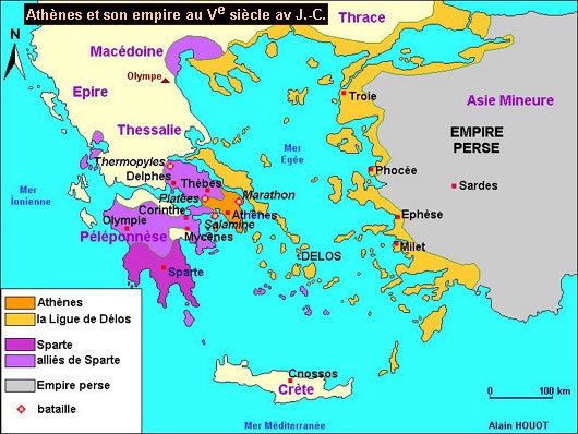 C’est dans la demeure de la courtisane Timandra qu’il meurt assassiné en Phrygie, à la demande de l’un d’eux. La marionnette Alcibiade est devenue sans doute plus encombrante qu’utile. A ce moment, Athènes perd définitivement son aura politique sur les cités grecques. Lentement l’empire perse élargit son hégémonie de l’Adriatique vers la Méditerranée. Il a pu maintenir son ascendant grâce à des guerres incessantes qu’il a poussées entre les cités s’alliant le plus fréquemment à Sparte. Profitant de l’affaiblissement d’Athènes, la Macédoine, alliée de la Perse, a peu à peu investi la Grèce en entrant dans les conflits existants et ceci jusqu’à Philippe, le père d’Alexandre le Grand.