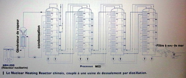 Une partie de la chaleur peut par conséquent être extraite sous forme de vapeur pour être ensuite canalisée, par l’intermédiaire d’un circuit supplémentaire, vers une usine de dessalement. On parle dans ce cas de couplage direct, car la chaleur est directement utilisée pour le dessalement, sans avoir été au préalable convertie en électricité. La méthode de dessalement la plus appropriée dans ce cas est celle de la distillation, plus particulièrement la distillation à effets multiples (Multi-Effect Distillation ou MED). Une centrale composée de deux unités VK-300 permettrait de produire, en plus de 357 MW d’électricité, 300 000 m3 d’eau douce par jour. Le NHR-200 chinois, en construction dans la ville de Yantai (dont la mise en activité est prévue en 2007) devrait produire 160 000 m3 d’eau potable par jour. Un projet est également à l’étude au Maroc, pour l’implantation d’un réacteur NHR-10 dans un premier temps (pour une production de 8 000 m3/jour) puis d’un réacteur NHR-200 devant lui aussi produire 160 000 m3/jour.