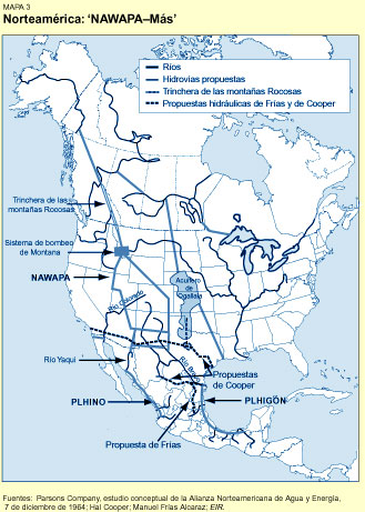Imaginé à la fin des années 1950, le projet NAWAPA [1] regroupe une série de projets conçue pour dévier de grandes quantités d’eau en provenance de l’Alaska et du bassin du Yukon au Canada qui aujourd’hui s’écoulent dans l’Océan pacifique, et de les conduire, en traversant le Canada et les Etats-Unis, jusqu’aux régions désertiques du nord du Mexique. Ce travail herculéen ferait appel à toute une série de canaux, de barrages, d’ascenseurs fluviaux et de tunnels capables d’amener l’eau à destination et surtout de transformer tout au long du trajet, grâce à l’irrigation, quelque 128 000 km2 de territoires arides en terres fertiles.