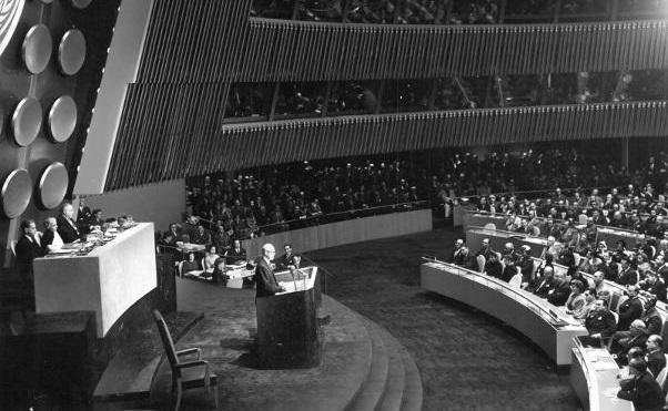 Le 8 décembre 1953, au cours d’un discours devant l’Assemblée générale des Nations Unies, Eisenhower présenta sa vision la plus intime. Une initiative appelée « atomes pour la paix » fut alors soumise à la communauté internationale. Le président américain fit part de son désir de construire entre les grandes puissances nucléaires un nouveau climat de confi ance, d’engager, par le partage du savoir-faire et des connaissances liées à l’atome, l’humanité toute entière dans une nouvelle aventure commune, celle d’un développement et d’une prospérité mutuels.