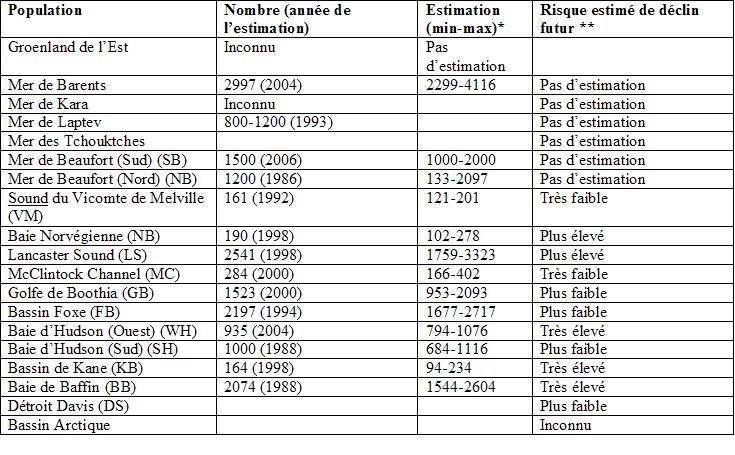 Ce tableau montre l’état des populations d’ours polaires en 2005, et a été adapté du tableau de l’état des populations tiré des Comptes-rendus de la réunion de 2005 à Seattle (Washington) du Groupe des spécialistes des ours polaires, sponsorisé par des environnementalistes. Il montre les zones de population et le nombre d’ours observés, accompagné du risque de déclin. Dans les cas de la Baie d’Hudson (Ouest) et de la Baie de Baffin, les populations d’ours polaires sont indiquées comme courant le risque d’un très fort déclin de population ; ceci est dû à une chasse non régulée par les habitants de la région, et à une vente trop importante de permis de chasse. Dans le cas de la Baie de Baffin, le problème de la chasse est aggravé par le fait que la population d’ours polaires est surveillée par deux nations différentes : le Canada et le Danemark.