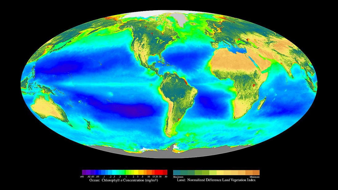 Si nous regardons une carte générale de la planète, comme celles publiées par la NASA ou d’autres agences, nous voyons comment cette activité associée à la photosynthèse est répandue sur la planète. (Figure 2) Et vous verrez qu’il existe, même aujourd’hui, des régions immenses où il n’y a pratiquement pas d’activité. Vous avez de grands déserts, comme la Grand désert américain que NAWAPA viendrait transformer et développer. Il y a le Sahara en Afrique. Et puis dans les océans, il existe de vastes régions désertiques là aussi.