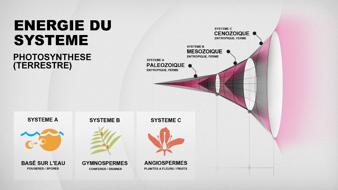 Nous avons donc ici une figure représentant des cônes imbriqués. En premier lieu, pour la biosphère (et nous le verrons de manière plus détaillée plus loin), l’énergie totale de base du système est définie par l’activité associée à la photosynthèse. C’est la manière par laquelle la matière organique peut capter l’énergie du Soleil et la transformer en quelque chose pouvant être utilisé par la vie. Ceci est donc en quelque sorte la base de tout. Vous savez, tout ce qui arrive avec la vie dépend ultimement de ce processus de photosynthèse.