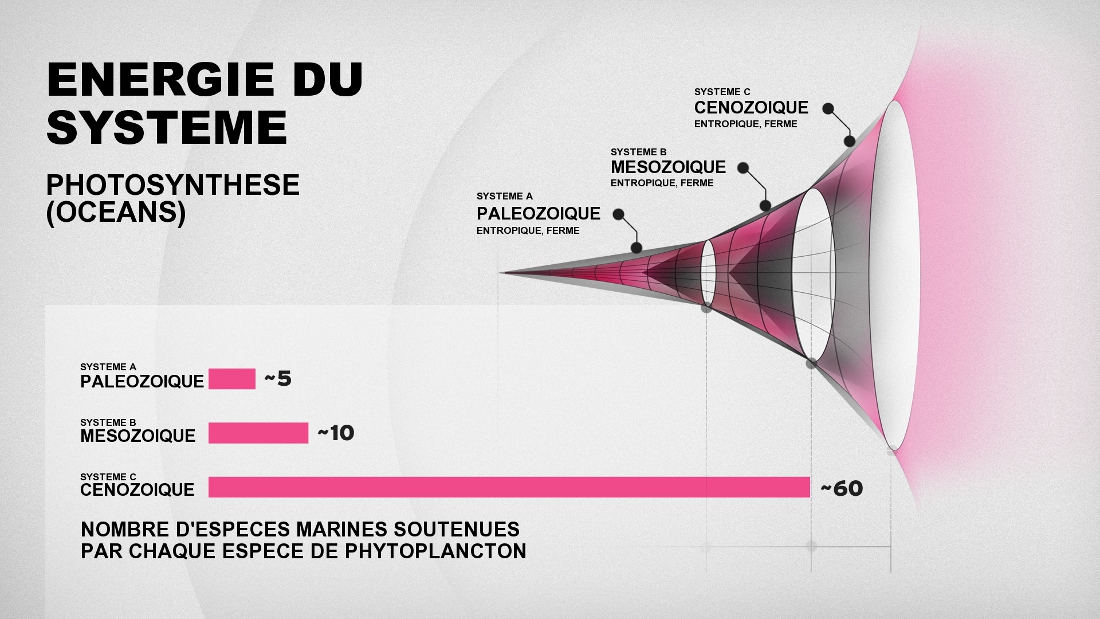Et puis il y a eu l’extinction KT, accompagnée d’un « saut » similaire. Il existe plusieurs manières d’illustrer comment l’énergie de l’ensemble du système s’est accrue, mais une manière de le faire est de comparer combien d’espèces de vie supérieure peuvent se caler, dans chacun de ces trois systèmes, pour chaque espèce à capacité photosynthétique au sein des océans. Et ainsi vous observez cet accroissement à partir de 5, puis 10, puis 60 espèces en passant d’un système à l’autre. Donc, avec cette croissance de la base photosynthétique, et par conséquent de l’énergie du système, des formes de vie de plus en plus complexes et avancées, des systèmes entiers plus évolués peuvent être dès lors maintenus. Mais ce n’est pas une simple croissance linéaire. Ceci nous ramène à la question que nous avons déjà posée, celle de la densité du flux d’énergie du système, étroitement liée au principe gouvernant ces sauts qualitatifs vers le haut, ce processus anti-entropique. De même que pour les processus économiques sains, chaque saut qualitatif est accompagné d’un accroissement de l’énergie du système dans son ensemble, ainsi que d’un accroissement dans la consommation d’énergie, par tête ou dans ce cas ci par espèce.