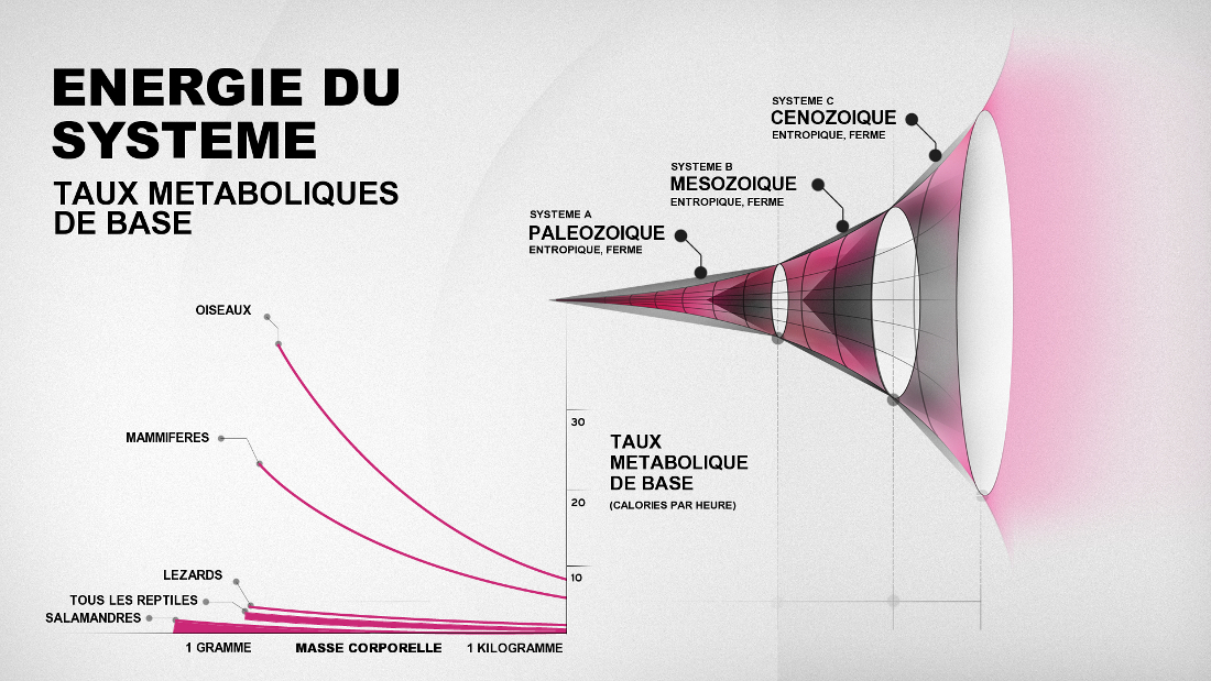 Une manière intéressante d’illustrer ceci est de prendre un gramme de chair de différentes créatures, par exemple un gramme de chair de souris, et de le comparer à un gramme de chair de lézard, ou de salamandre, par exemple. La quantité de nourriture, d’eau, d’oxygène ou de respiration nécessaire au maintien de ce gramme de chair diffère complètement, et ce de manière qualitative, d’une espèce à l’autre. Pour revenir aux mammifères, espèces devenues dominantes suite à l’extinction KP, et avant cela les reptiles, qui avaient dominé suite à l’extinction PT, ce que nous voyons est que le taux métabolique de base change, ce qui est une claire expression de la caractéristique d’accroissement de la consommation d’énergie, par espèce, et que ce taux doit s’accroître de plus en plus vite à mesure que ces sauts d’un système à l’autre apparaissent.