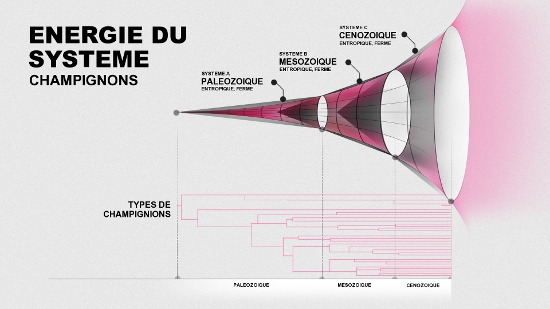 C’est la même situation partout, nous n’avons donné ici que quelques exemples, mais un autre qui est amusant est celui des champignons. (Figure 7) Au cours du paléozoïque, il y avait des champignons très primitifs, qui n’étaient pas capables de décomposer la matière organique des arbres et autres types de plantes. Ceci a été accompli seulement après ces sauts successifs dans le système. Mais qu’est-ce que cela signifie ? Ceci a provoqué un grand accroissement dans le cycle du carbone, ainsi que celui de l’oxygène, car ces champignons évolués pouvaient décomposer la matière organique à un taux plus élevé, et par conséquent accroître le taux de transfert du carbone provenant du vivant vers le non-vivant, puis vers le vivant à nouveau, la même chose avec l’oxygène. Nous avons donc à nouveau le même phénomène.