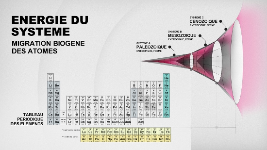 Le résultat, comme vous commencez à le voir, est la prédominance des squelettes à base de calcium et de phosphate, et en supposant que vous avez gardé vos lunettes à phosphore, vous voyez un accroissement soudain de la migration du phosphore sur toute la planète. Ceci est un élément que nous avons sélectionné dans le tableau périodique des éléments, mais nous pourrions en quelque sorte, pour chaque élément de ce tableau, tracer une histoire de la vie, avec en toile de fond cette question de l’accroissement de la vitesse de circulation, la quantité passant à travers chaque singularité du système à un instant donné.