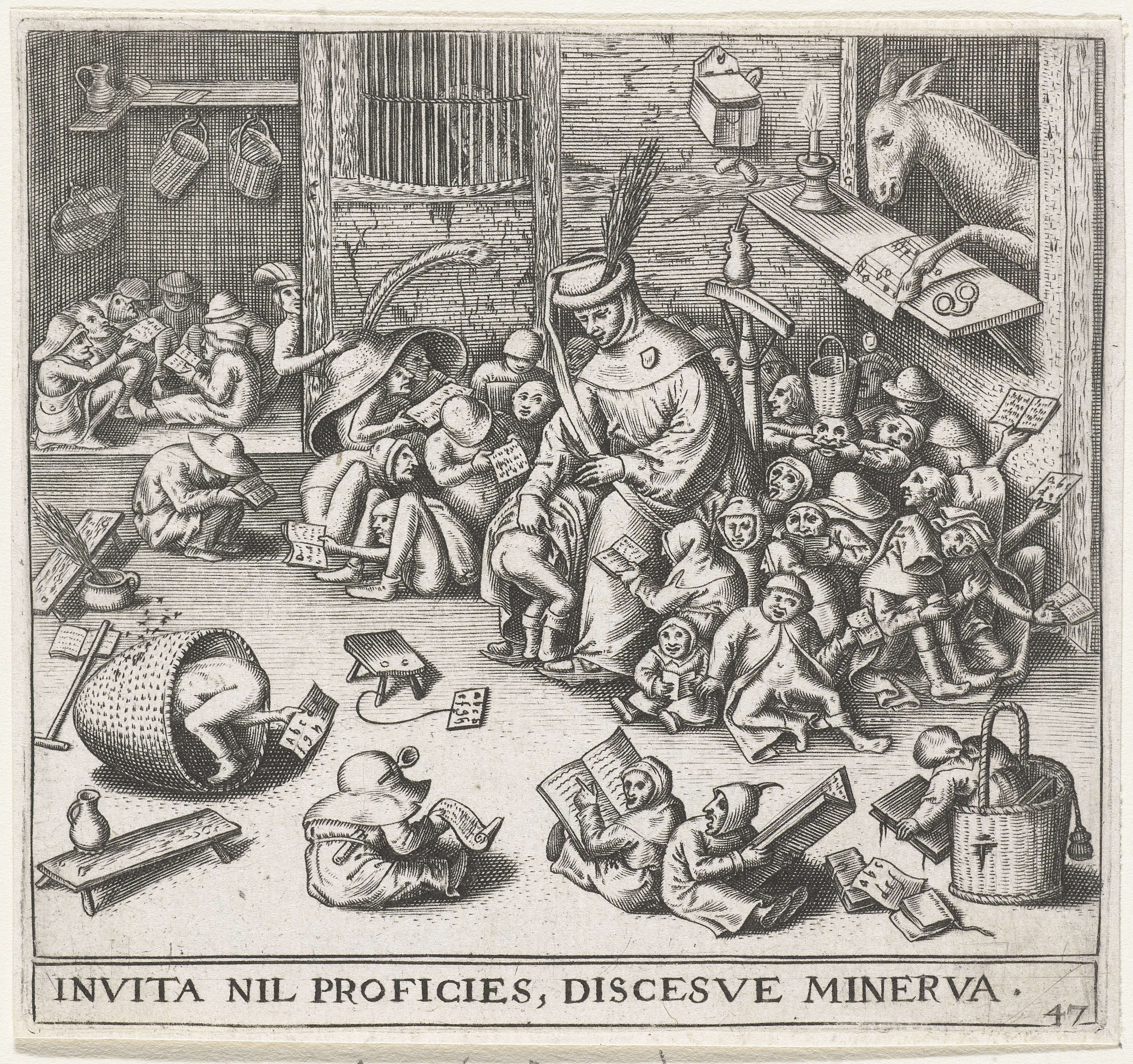 M. Gibson : Tout a fait. Les estampes sont très souvent des dictons populaires comme Les gros poissons mangent les petits (1556) ; Elck (1558) (l’égoïsme de « chacun » conduit au chaos). Ou encore L’âne à l’école (1556) et L’al-ghemist (1558) (le « tout raté ») qui était une polémique contre les délires alchimistes de l’époque. On pourrait la refaire aujourd’hui contre l’astrologie !