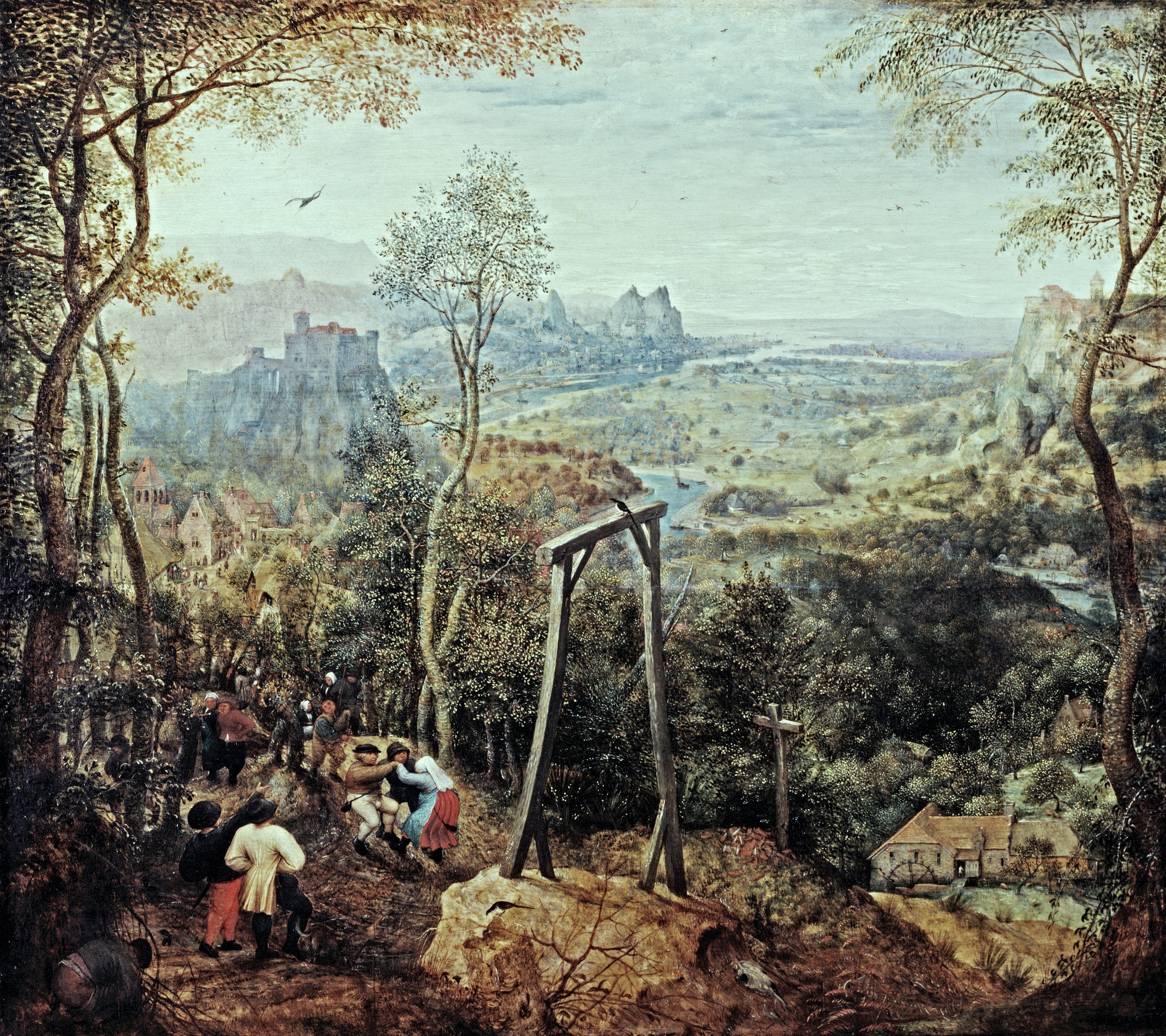 M. Gibson : Les gens sont spontanément attirés par Bruegel parce qu’ils ressentent quelque chose d’universel. J’explique ce mot parce que l’expression est devenue un peu bateau. Brueghel montre tout ce qui existe de la petite enfance jusqu’à la vieillesse ; du jeu de l’enfant jusqu’aux plus abominables tortures. Il y a une juxtaposition des deux. C’est pour ça que je suis tellement frappé par ce groupe qui s’avance vers le Golgotha dans le tableau Le portement de croix. On y voit un grand garçon qui chipe le bonnet d’un petit enfant qui tente de le reprendre. Et juste à côté on prépare la mise au mort des malheureux qui vont monter vers le Golgotha. Les deux larrons aux visages gris, assis dans la charrette. Et le Christ qui est là, perdu dans la foule immense. Tellement il est petit dans ce grouillement humain qu’on a du mal à le retrouver.