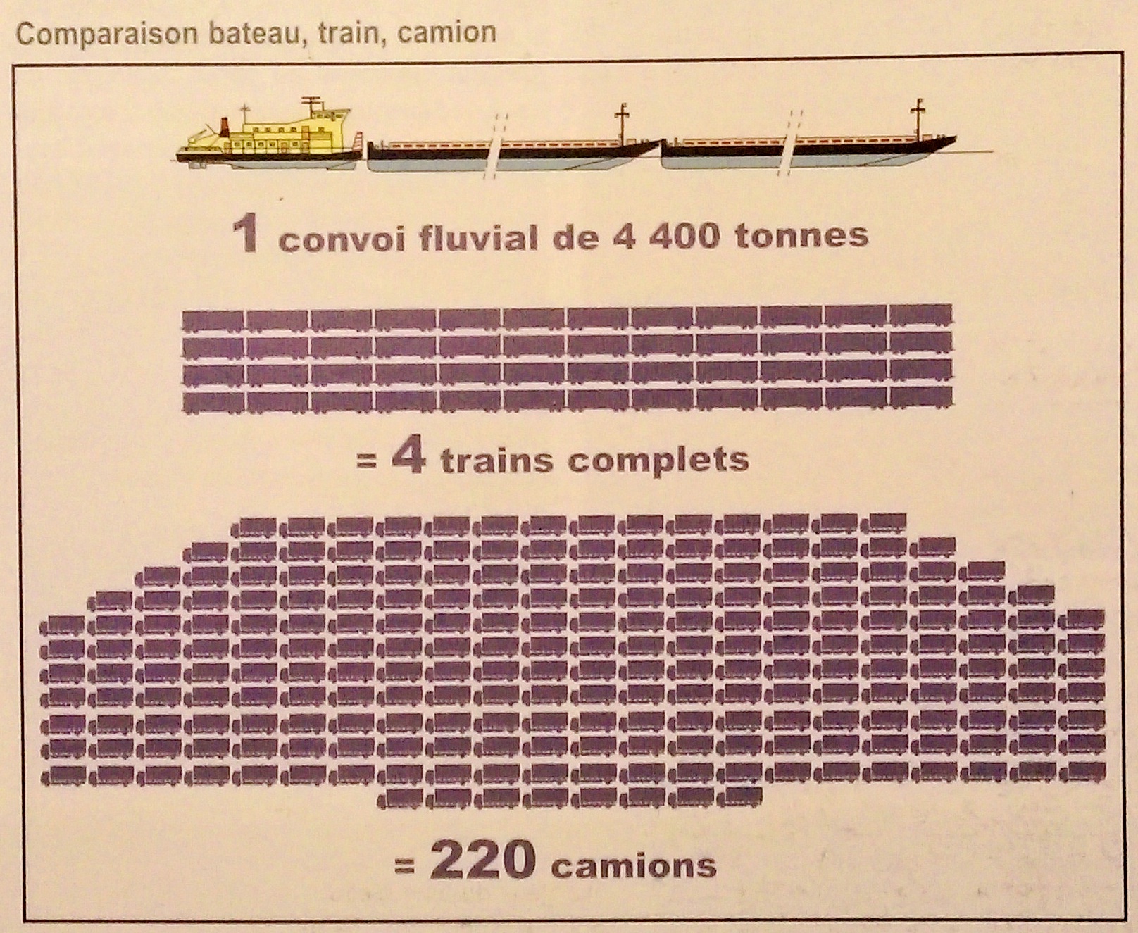 Un pousseur de barges opérant un convoi de 4400 tonnes sur un canal à grand gabarit transporte l’équivalent de 4 trains entiers de marchandises ou de 220 camions de 20 tonnes. Avec 5 litres de carburant, un camion peut transporter une tonne de marchandises sur une distance de 100 km, tandis qu’avec le train on atteint 312 km et avec la voie d’eau, entre 215 et 500 km. Ainsi, on estime que le coût par tonne/km oscille entre 0,03 et 0,45 euro pour le fluvial, bien en dessous du rail et deux à trois fois moins cher que la route. Le trafic maritime obéit aux mêmes lois. Une part significative du trafic de conteneurs partant ou arrivant dans des départements français, détournés au profit d’Anvers, Zeebrugge et Rotterdam, le sont pour des questions de prix de bout en bout.