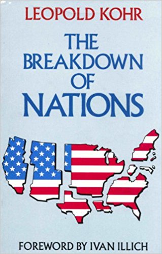 « La grandeur de l’idée suisse, donc, » dit-il, « est la petitesse de ses cellules [les cantons] qui en sont le garant. » « Il faut se diviser pour mieux s’unir », nous dit-on. Si la défense du Kleinstaat, le petit état, amena Kohr à dire que « Chaque fois que quelque chose va mal, quelque chose est trop gros », son ami et disciple Fritz Schumacher reprendra à son compte le célèbre dicton de Kohr « Small is Beautiful » avec lequel on lavera le cerveau de toute une génération de baby boomers écolos.