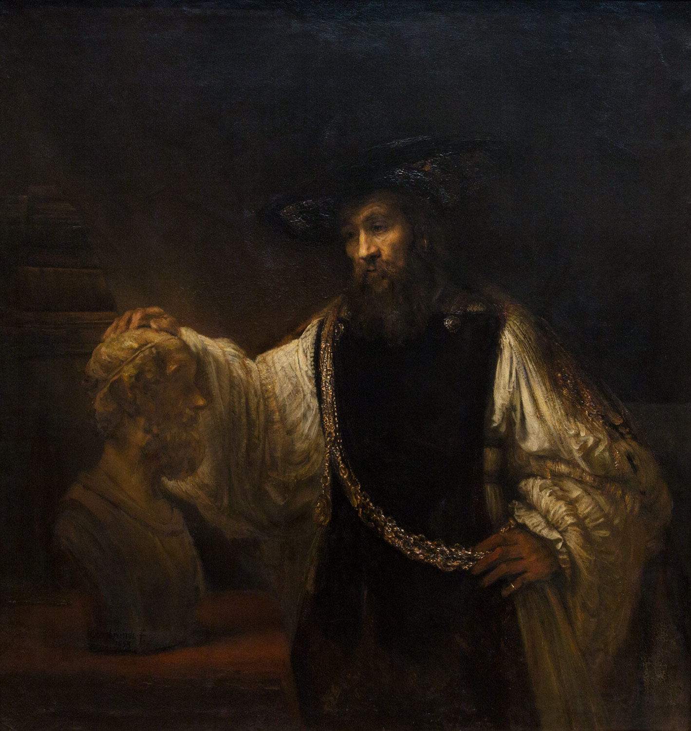 Puisque l’inventaire (lors de sa mise en faillite forcée par ses ennemis) de 1654 ne mentionne aucun livre en dehors d’une grosse bible, les écrivains romantiques nous ont souvent dépeint un Rembrandt « poète maudit », génie narcissique, fils de meunier peu instruit faisant fi de la littérature et de la philosophie. Aristote contemplant le buste d’Homère [FIG15] nous démontre le contraire.