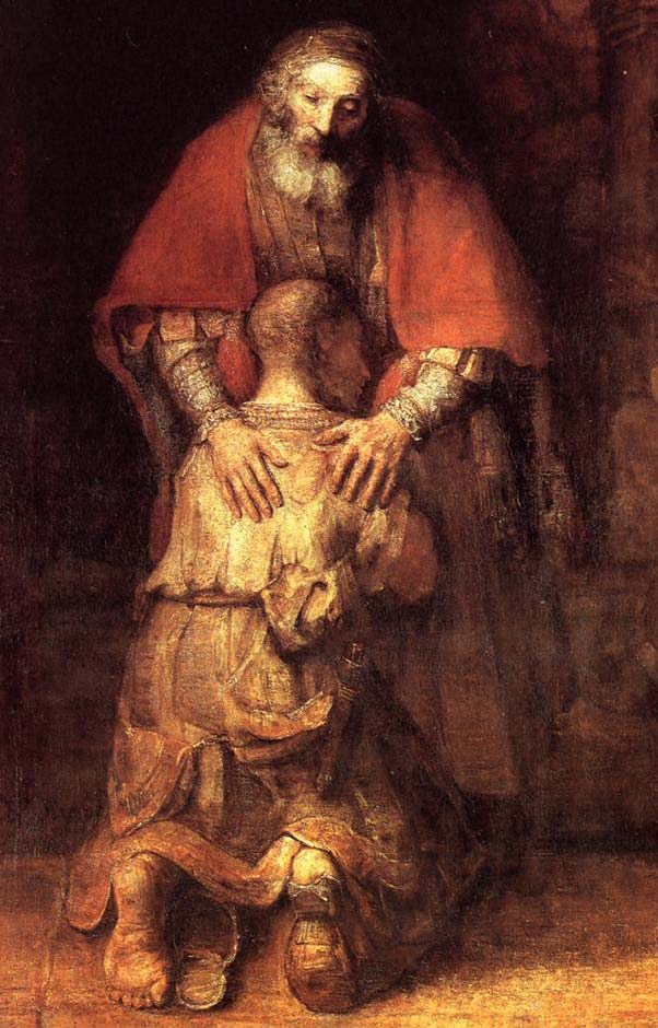 Un de ses derniers tableaux, le Retour du fils prodigue [FIG. 5], bien que complété par un élève après la mort du peintre, traite magnifiquement le sujet du pardon. Le tableau, d’importante dimension (262 x 205 cm) possède une très grande expressivité. Le père, les yeux pincés dans une vision intérieure et regardant le chemin par lequel son fils est arrivé, semble douter de son bonheur, car son fils « qui était mort » est « revenu à la vie ». Ce dernier place sa tête de bagnard sur le ventre de son père et se livre entièrement, dans un acte de repentir. Le père pose ses mains sur les épaules de son fils et lui accorde son pardon, tandis que les frères, jaloux de tant d’attention envers celui « qui a mangé le bien paternel avec des prostituées », sont fortement troublés.