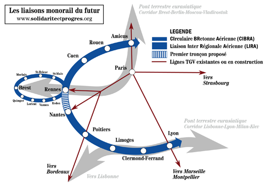 Cependant, pour ne pas polariser toute l’activité régionale autour de l’axe Rennes-Nantes, le tronçon LIRA devra également s’articuler avec une vaste Circulaire bretonne aérienne (CiBrA), un vaste pourtour de la Bretagne reliant par Aérotrain la plupart des grandes agglomérations situées entre Rennes et Brest. Des jonctions reliant Nantes et Saint-Nazaire à la CIBRA, via Redon, permettront aux habitants de ces villes de se rendre à Brest en 1h15.