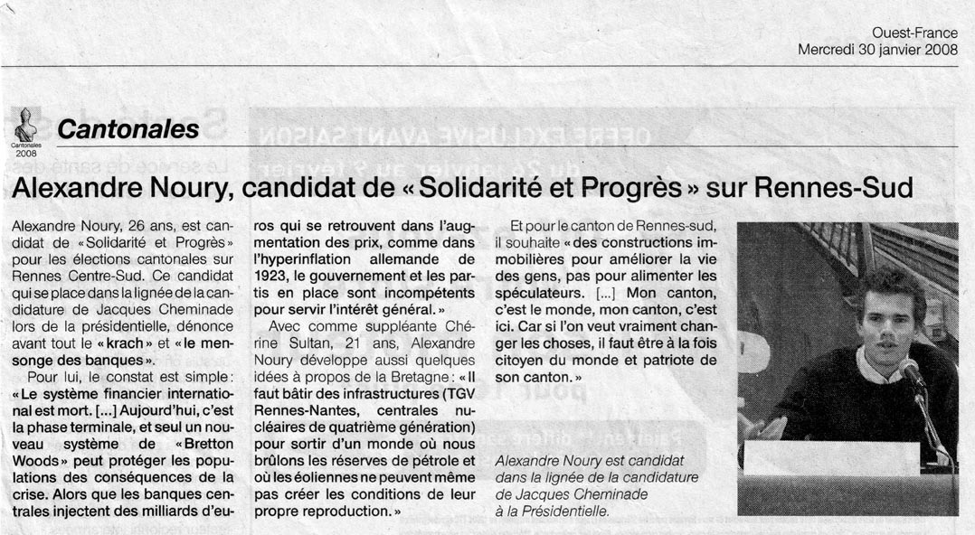 Solidarité & Progrès présente quatre candidats aux élections cantonales du 9 et 16 mars prochain. Le mot d’ordre : bouffe et développement à long terme. La désintégration financière frappe jusque dans les assiettes et la réponse politique oscille entre les déclarations de bonnes intentions, le vide et le pire - le Traité de Lisbonne. C’est le système qui est en train de mourir et la seule sortie de secours est la reprise en main du système financier par les Etats ; c’est le combat mené par Lyndon LaRouche pour un nouveau Bretton Woods et que nous animons ici pour inspirer les citoyens, les autres candidats et partis, et les élus.