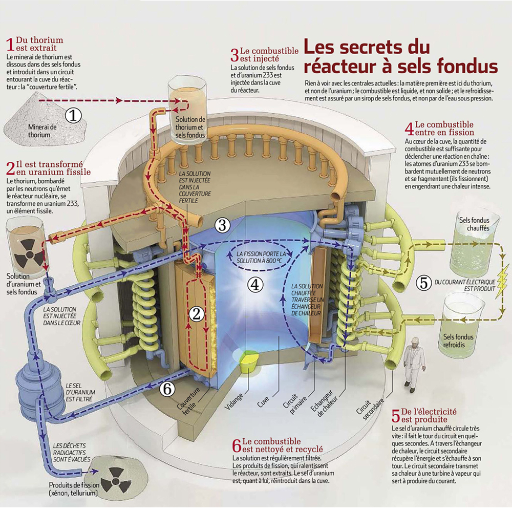 - élimine ou réduit de dangereuses manipulations : le combustible liquide permet le retraitement du combustible sur place et ne nécessite pas l’arrêt du réacteur.