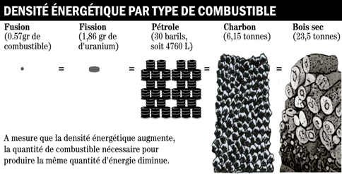 Autre mesure clé du rendement énergétique des différentes sources, la quantité de combustible nécessaire pour générer la même quantité d’énergie. Le tableau ci-dessous montre qu’avec un grain d’uranium, on peut produire autant d’énergie qu’avec 23,5 tonnes de bois sec !