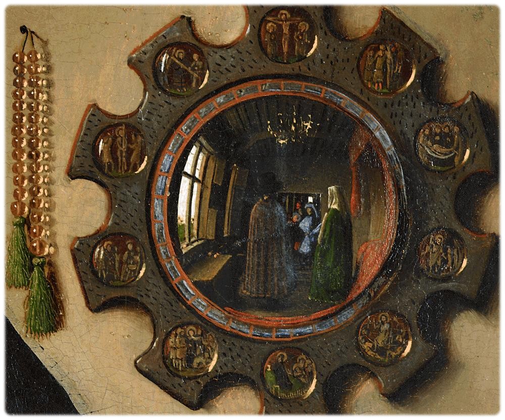 Enfin, on voit dans le miroir deux personnages, mais pas l’image du peintre derrière son chevalet. Il s’agit sans doute des deux témoins du mariage. Au lieu de signer son tableau avec « Van Eyck a fait ceci », le peintre signe ici son tableau au-dessus du miroir avec « Van Eyck a été ici présent » [17] s’identifiant lui-même comme témoin.