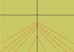 Dans ce modèle, un certain nombre de lignes de fuite, au lieu de coïncider dans un seul point de fuite central sur l’horizon, se retrouvent soit dans une « région de fuite » [13](Fig. 14), soit s’alignent sur ce que certains appellent un « axe de fuite » vertical formant ainsi une espèce d’arête de poisson (Fig. 15).