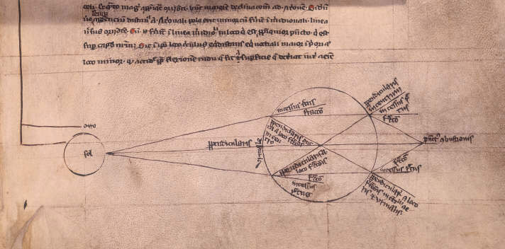 Comme nous l’avons déjà mentionnés, ces études furent reprises par les franciscains d’Oxford, en commençant par l’évêque anglais de Lincoln, Robert Grosseteste (1168-1253). Dans De Natura Locorum Grosseteste montre par exemple un schéma de la réfraction de la lumière dans un verre sphérique rempli d’eau (Fig. 9).