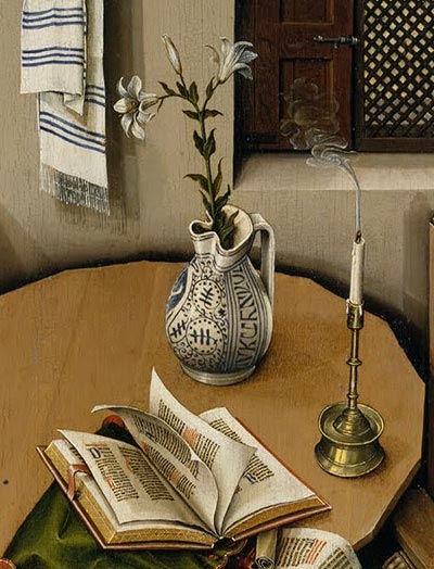 Par exemple, dans le Retable de Mérode de Campin (Fig. 3), on voit que la perspective exagérée de la table permet de montrer avec clarté que le vase se situe derrière le chandelier et le livre.