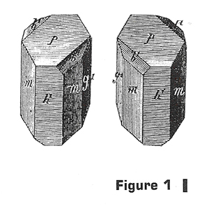 Ce point de vue de Bernard est parfaitement illustré par une découverte de Pasteur sur la dissymétrie moléculaire qui a considérablement influencé les Curie puis Vernadski. Pasteur a synthétisé en laboratoire, par différents procédés, ce que nous appelons aujourd’hui « acide tartrique », mais qui était appelé à son époque « acide racémique » parce que produit par le jus de raisin. Bien que les acides produits dans le laboratoire et par le jus de raisin eussent la même composition chimique, Pasteur se rendit compte que deux solutions contenant chacune l’un des deux, avaient des comportements optiques différents. Observant alors les cristaux de ces acides au microscope, il découvrit que ces derniers pouvaient être classés en deux catégories distinctes, L et D (lévogyre et dextrogyre), chacune étant l’image miroir de l’autre (Figure1).