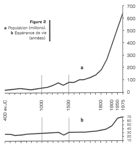 Fort de ses découvertes sur la transmission des germes, Pasteur put ensuite s’attaquer aux maladies contagieuses et à la recherche de vaccins. Sa découverte du vaccin de la rage, en dépit du fait que le virus était trop petit pour être vu avec les microscopes de son époque, n’aurait pas été possible si le point de vue de Pouchet avait prévalu. Et cette découverte a servi elle-même de modèle à ses élèves, les pastoriens, qui se sont lancés à l’assaut des grandes épidémies dans les pays du Sud. Les conséquences des travaux de Pasteur et de ses élèves se lisent sur une courbe démographique (Figure 2).