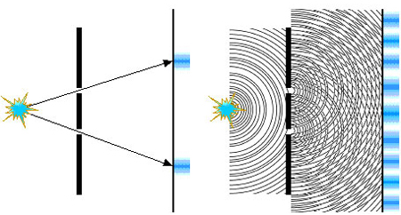 Les phénomènes ondulatoires se caractérisent par ce que l’on appelle des « interférences ». Les ondes ou vagues transversales, comme celles qu’on produit à la surface de l’eau, sont toutes composées de pics et de creux. Si deux vagues se croisent, leurs hauteurs « se combinent » l’une à l’autre de telle manière que, lorsque deux pics se rencontrent, la hauteur de la vague est augmentée et lorsqu’il s’agit d’un pic et un creux la hauteur du pic se voit diminuée. Si une série de vagues rencontre un obstacle percé de deux trous, chaque trou deviendra la source d’une nouvelle série de vagues, et par conséquent deux séries de vagues se propageront de l’autre coté de l’obstacle. Si on place un écran plus loin en amont, les vagues produiront des franges d’interférence.
