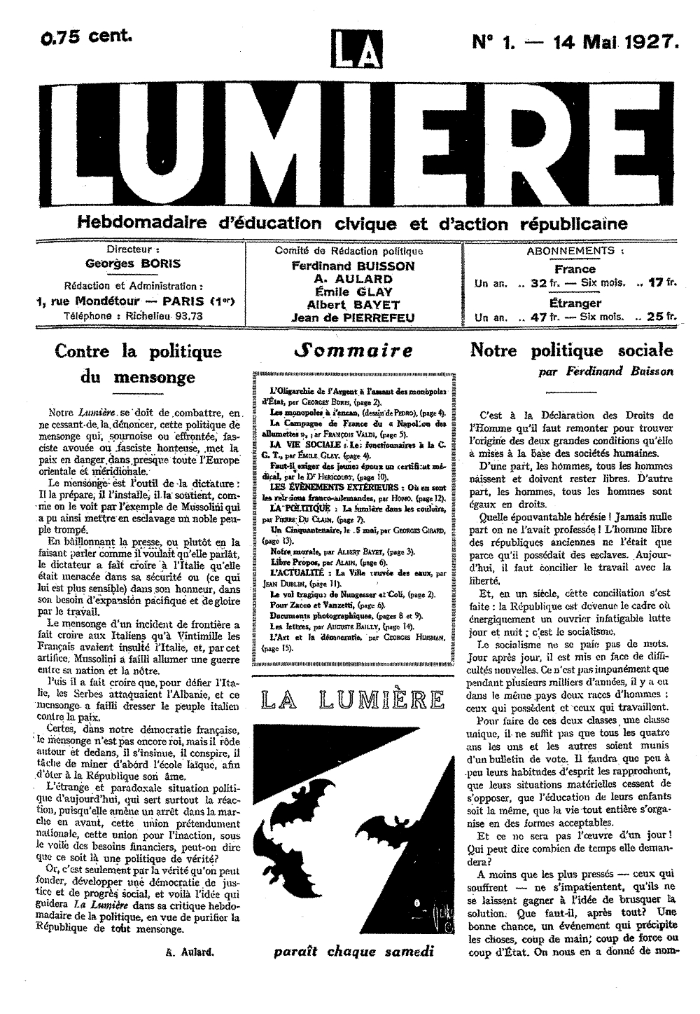 Au sommaire du premier numéro de La Lumière (14 mai 1927), un article de Boris intitulé : « L’oligarchie de l’argent à l’assaut des monopoles d’État », ainsi qu’un éditorial d’Alphonse Aulard expliquant le pourquoi de la publication :