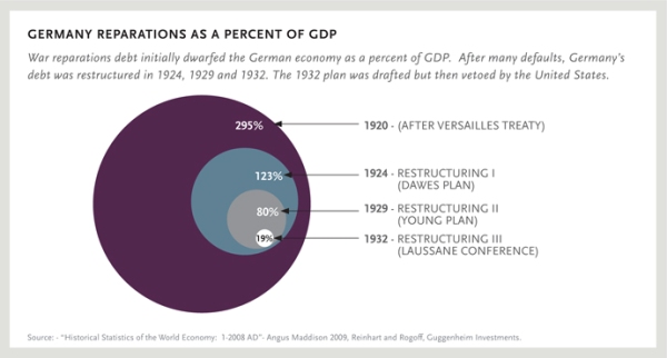 A la fin de la guerre, pour honorer eux-mêmes leurs dettes auprès des banquiers anglo-américains, les pays alliés fantasmaient sur les montants qu’ils espéraient extorquer aux Allemands. En 1919, l’un des délégués américains à la conférence de Versailles se nommait d’ailleurs Thomas W. Lamont, un proche et partenaire d’affaires de J.P. Morgan, chargé de veiller au grain. Pour sa part, interrogé sur les difficultés de la reconstruction en France, Clemenceau répondra : « L’Allemagne paiera ! »