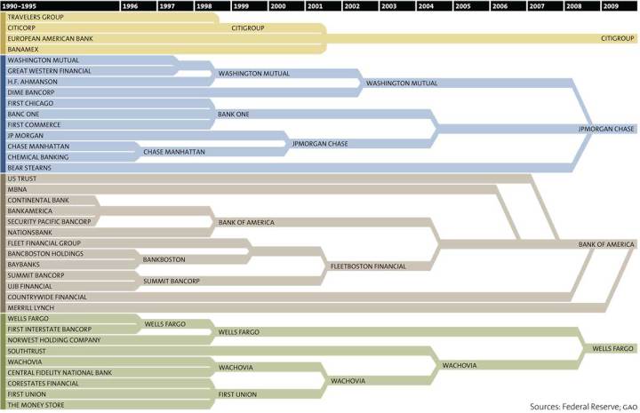Après la libéralisation de la sphère financière amorcée dans les années 70, ayant ouvert les mouvements de capitaux et confié aux marchés – et non plus aux États – le rôle de déterminer les taux de change ou d’intérêts, la globalisation des marchés se généralise vers le milieu des années 90. Les plus grandes banques s’adaptent alors à ce nouvel espace d’échanges, en fusionnant et en se restructurant.