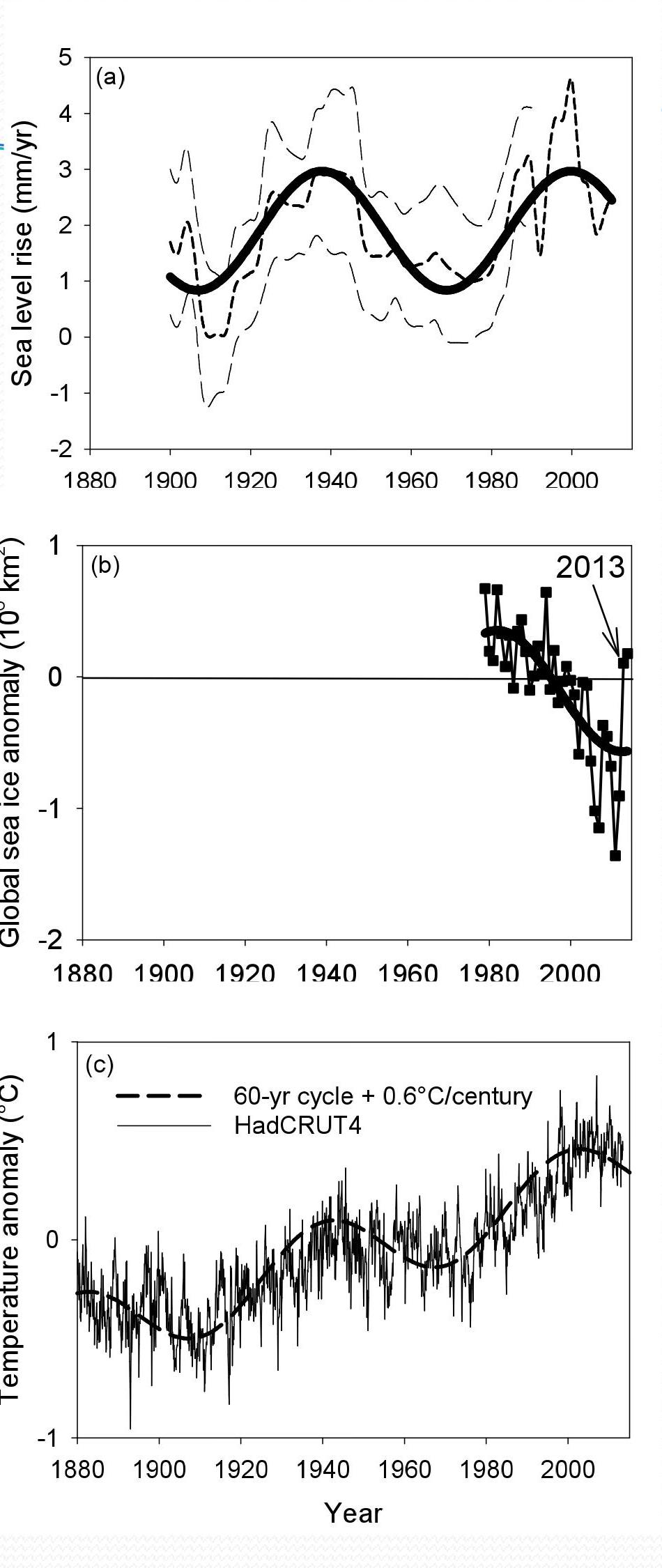 Ce cycle d’environ 60 ans se manifeste ainsi non seulement sur la température (figure du bas), sur les banquises comme nous venons de le voir (figure du milieu), mais aussi sur la hausse du niveau des océans (figure du haut). Les données sont celles de la Figure 3.14 du rapport AR5 du GIEC, ici simulées par le cycle de 60 ans.