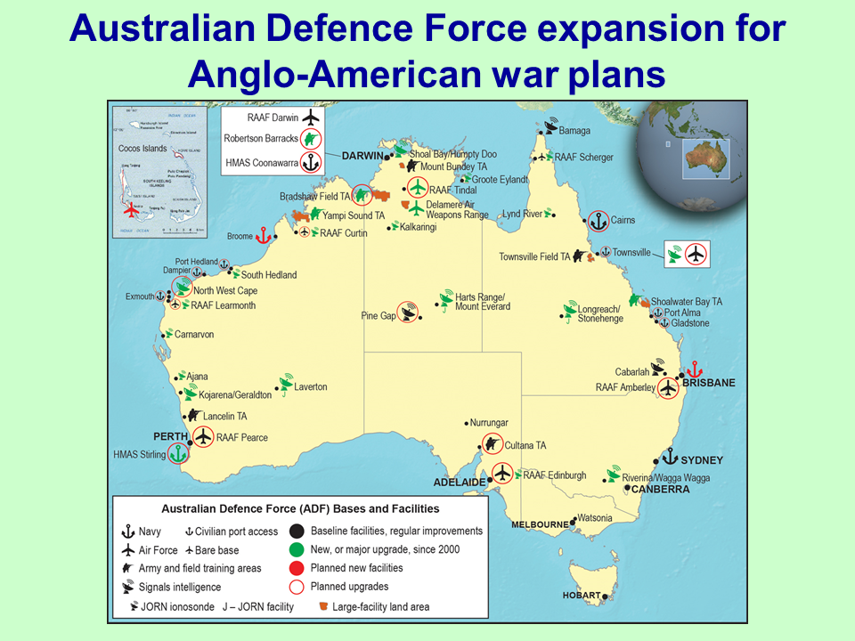 Au milieu du continent, encerclé en rouge pour désigner une base en cours d’agrandissement, vous pouvez voir Pine Gap, la base des renseignements qui aide au guidage des drones opérant au Moyen-Orient, et qui est un élément essentiel du système de défense antimissile balistique mondial américain, dans la stratégie de première frappe des Anglo-américains contre la Chine et la Russie. Déjà, durant la Guerre froide, Pine Gap revêtait une telle importance dans les plans de guerre nucléaire anglo-américains que les soviétiques considéraient l’Australie comme une cible de premier plan.