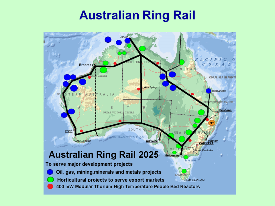 Notre avons également un projet visant à développer le transport maritime à grande vitesse, domaine dans lequel nous sommes déjà au rang de leader mondial ; la construction d’un réseau ferroviaire à grande vitesse afin d’unifier notre vaste continent ; le redéveloppement de notre secteur des machine-outils, qui était dans le passé réputé, afin que nous puissions exporter des biens d’équipements vers l’Asie ; et un programme visant à envoyer des Australiens dans l’espace. Le projet du professeur Endersbee pour construire un anneau ferroviaire à grande vitesse, en parallèle avec le développement du transport maritime à grande vitesse, rendra possible l’exportation de machines agricoles ou de machine-outils vers n’importe quel port en Asie, en un à quatre jours.