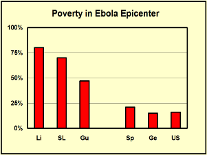 La pauvreté en Afrique de l’Ouest a été considérablement aggravée par 14 années de conflit interne à rallonge au Liberia, et 11 années au Sierra Leone, des guerres qui ont rendu ces états ingouvernables. Dans toute cette période, en conséquence, il n’y a eu aucune éducation de la jeune génération, ce qui complique grandement les efforts d’information des populations à propos de la nature de la maladie, et de ce qui doit être fait pour empêcher sa propagation. 75 % de la population libérienne est analphabète à cause de la guerre civile.