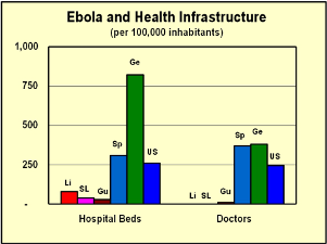 Dans un autre graphique, nous avons une comparaison de l’infrastructure de base de santé, en particulier des lits d’hôpitaux et aussi des docteurs pour chaque tranche de 100 000 personnes. Sur le côté gauche du graphique, vous voyez encore le Liberia, le Sierra Leone, et la Guinée, dont les pays n’ont que 4 à 8 lits d’hôpitaux pour 100 000 personnes, ce qui est minuscule comparé à l’Espagne, l’Allemagne, ou aux Etats-Unis.