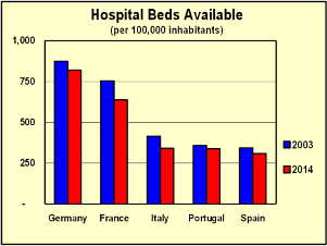 Nous avons aussi failli à notre obligation de fournir des services de santé en Europe même. Les systèmes de santé dans la plupart des pays européens sont au bord de la faillite et ont été réduits au strict minimum. En Allemagne, toutes les réformes de santé des dernières décennies ont été des programmes d’austérité pour rendre les hôpitaux et autres institutions rentables. Un aspect de cette austérité en Europe a été la réduction du nombre de lits d’hôpitaux entre 2003 et 2014, comme indiqué dans le graphique. Dans la seule Allemagne, il y a des rapports disant que plus de 300 hôpitaux sont sur le point d’être fermés dans les prochaines années.