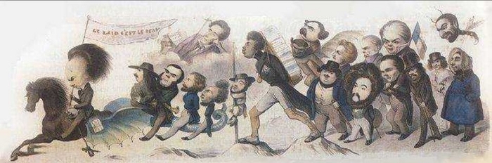 Ci-dessous nous pouvons voir une caricature de Benjamin Roubaud (1811-1847) qui donne une idée assez juste de l’image qui s’attachait aux romantiques dans le public et du mauvais goût dont on les taxait : sous la bannière « Le laid c’est le beau », on reconnaît Gautier, Eugène Sue (accroché au mât), Dumas, Balzac, Vigny et consorts. Lamartine, à droite de la bannière, bénit nonchalamment le cortège. Malgré le bon sens de la population et de quelques intellectuels quant au ridicule de la culture romantique de l’époque, ce courant deviendra quasi hégémonique dans le siècle, légitimant ainsi le repli sur soi-même, le désengagement politique, la recherche, ou l’acceptation, du malheur, en opposition complète avec les idéaux classiques.