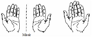 Autrement dit, on observe d’un côté des chaises ayant uniquement perdu leurs deux pieds droits (hémiédrie droite), et de l’autre, aussi bien des chaises dépourvues de pieds droits que de pieds gauches (hémiédrie droite et gauche). Or, ces deux formes hémiédriques sont en réalité des formes « énantiomères », images l’une de l’autre dans un miroir, telles la main droite et la main gauche dont les formes ne sont pas superposables.
