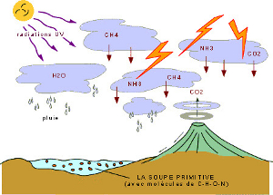Dans une « atmosphère terrestre primitive riche en méthane et ammoniaque », où des molécules chimiques se combinent grâce aux éclairs orageux secouant la troposphère terrestre, il imagine ces composés allant se dissoudre dans les océans en formant une soupe primitive, donnant naissance à des molécules comme des acides aminés... Ces « briques du vivant » s’assemblent entre elles pour former les macromolécules (protéines et acides nucléiques) constitutives des cellules vivantes.