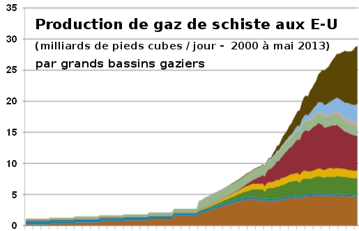 La production de gaz de schiste au Etats-Unis a progressé à un rythme effarant au cours des 12 dernières années, passant de 0 % de la production nationale de gaz naturel à près de 50 % aujourd’hui. Des centaines de milliards de dollars ont été investis, et pourtant la production stagne ou est déjà en déclin dans la majorité des grands bassins gaziers du pays. Comme l’a expliqué le quotidien londonien The Daily Telegraph cet été, la baisse de production du puits moyen de gaz de schiste (les Etats-Unis en comptent plus de 63 000), est beaucoup plus rapide que pour les puits de pétrole et de gaz traditionnels : il n’est pas rare d’assister à des chutes de production de 60 % dès la fin de la première année d’opération, contre 7 à 10 % pour les puits normaux. Le seul moyen de maintenir la production totale est par conséquent de percer plus de puits, ce que les investisseurs font déjà avec moins d’enthousiasme.